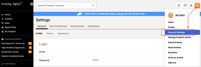 First, log in to your Seeking Alpha account, click on the profile icon, and click on "Account Settings".